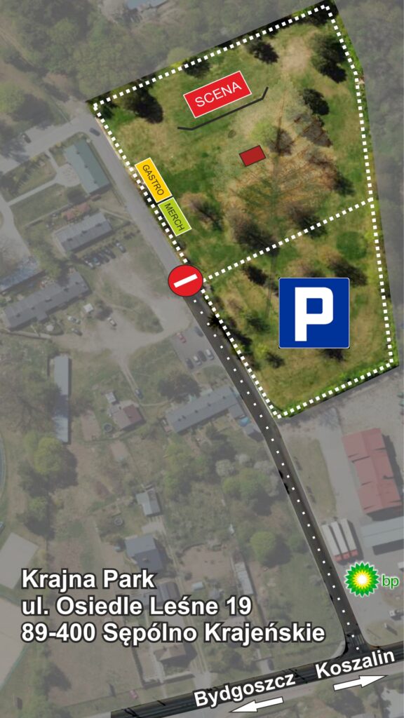 Aby zapewnić wygodę i bezpieczeństwo uczestników, udostępniamy bezpłatny parking na terenie Krajna Parku (przy ulicy Osiedle Leśne 19) – tuż obok miejsca festiwalu. To dogodna lokalizacja, która pozwoli zmotoryzowanym dotrzeć niemal pod samą scenę 😉